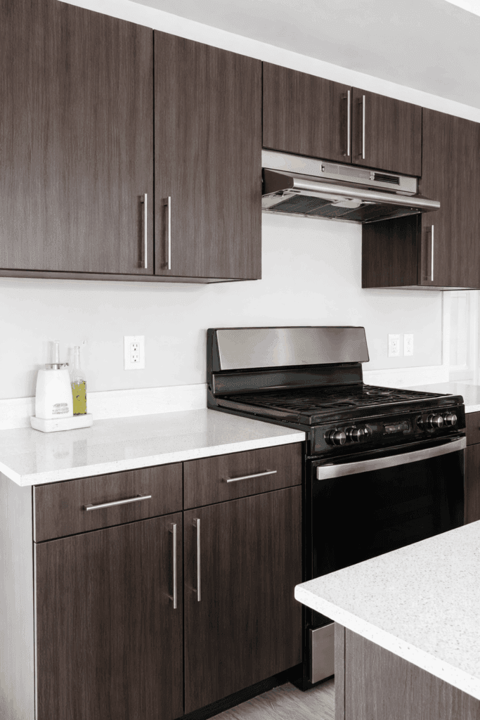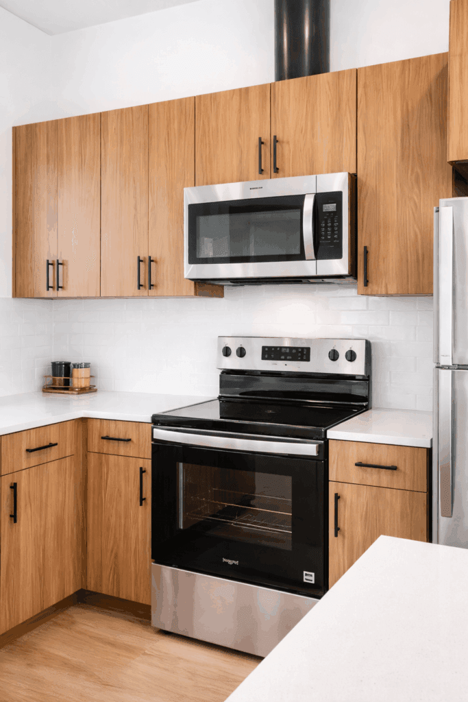 A clean kitchen featuring wood cabinets and stainless steel appliances, designed by SCS Multifamily.