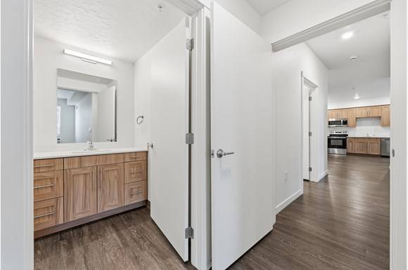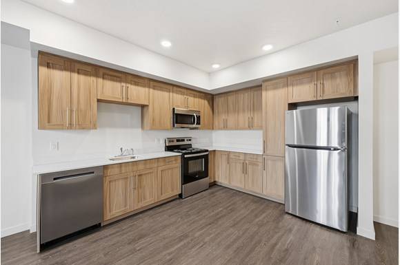 SCS Multifamily provided cabinetry and countertop solutions throughout each residence, focusing on consistency, durability, and clean design. Wood tone cabinetry brings warmth to the interiors, while streamlined countertops deliver a low maintenance surface ideal for high occupancy living.