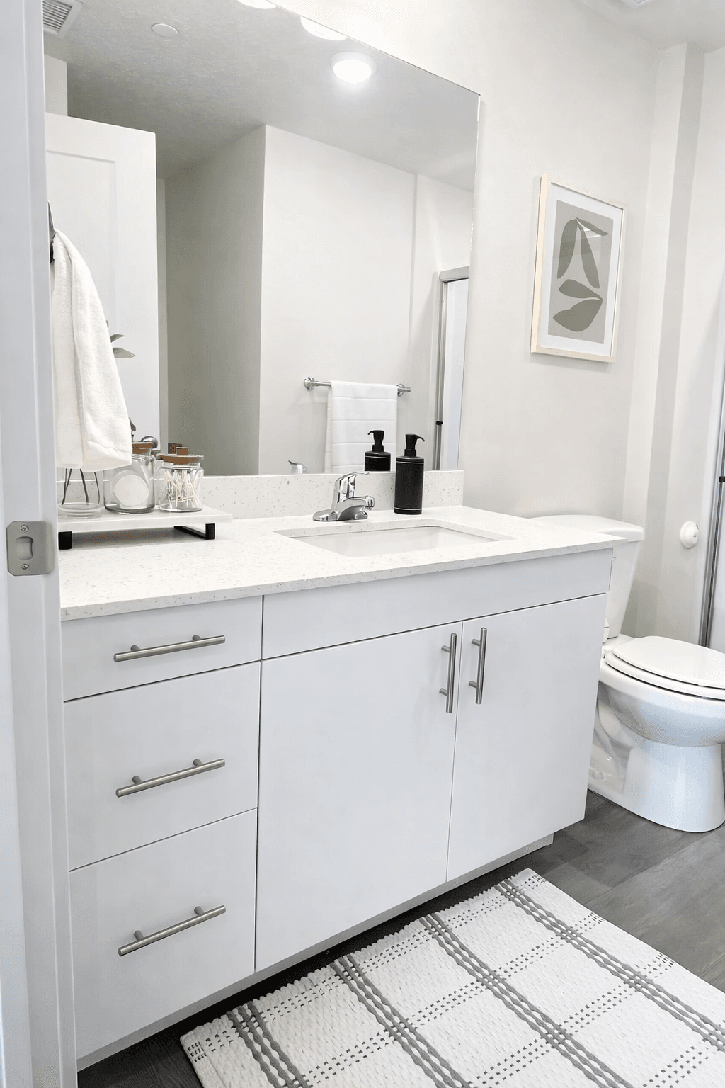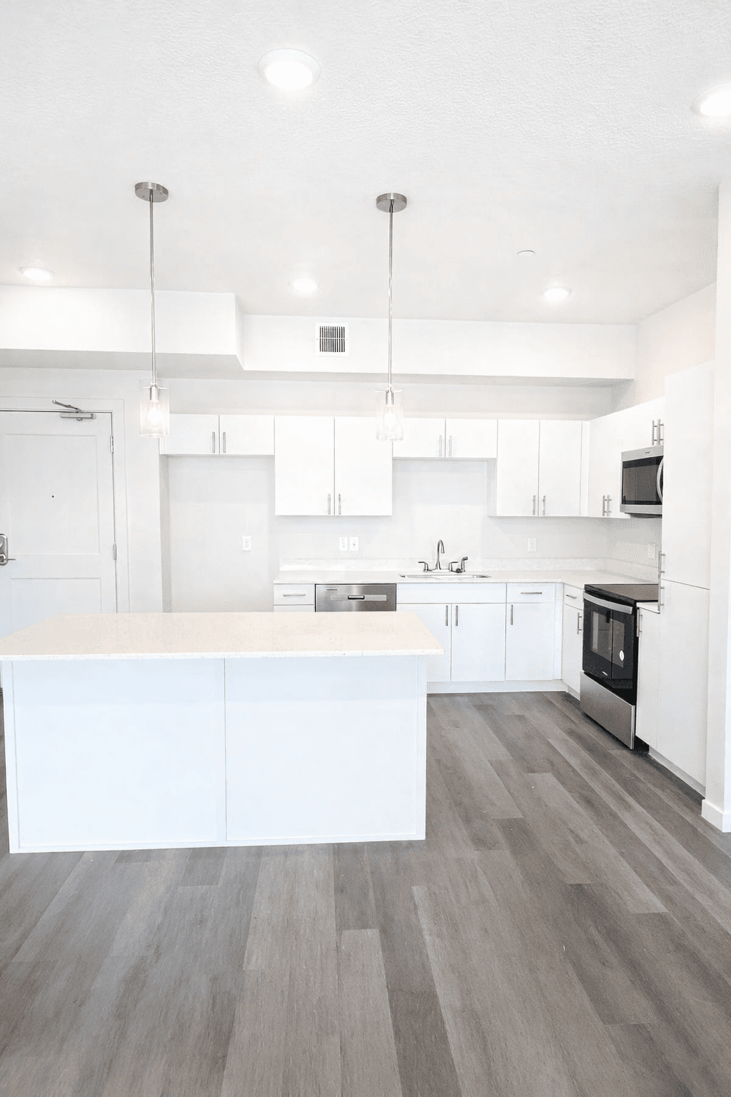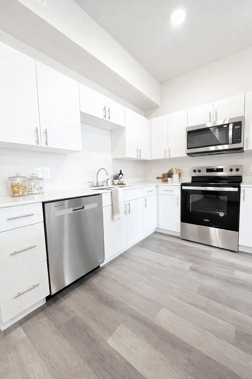 SCS Multifamily provided cabinetry and quartz countertop solutions throughout the project, including kitchens and bathrooms. Clean white cabinetry paired with durable quartz surfaces creates a cohesive, modern finish that enhances natural light while offering low maintenance performance for everyday living.