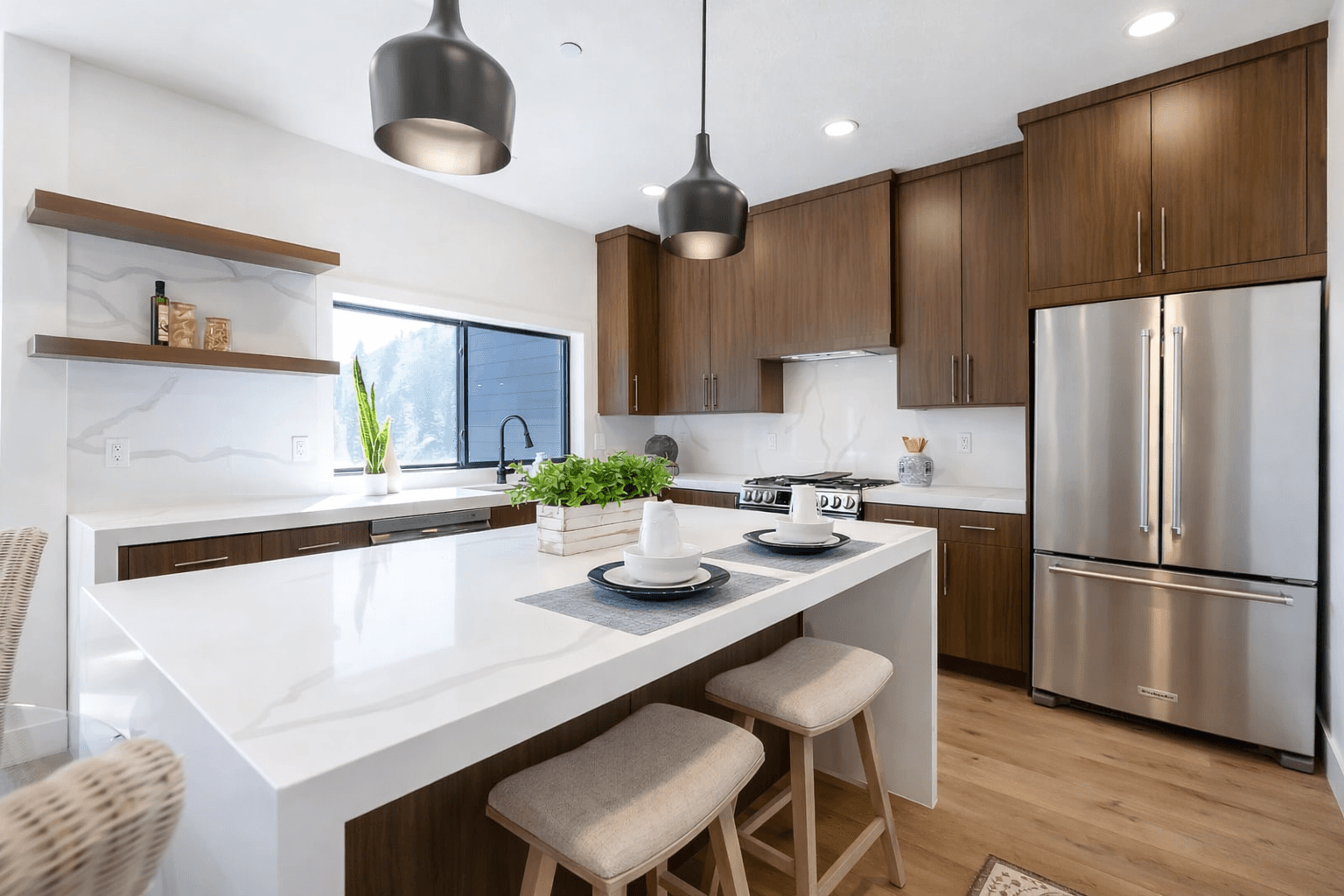SCS Multifamily provided custom cabinetry and quartz countertop solutions throughout each residence, including a striking waterfall island that serves as the focal point of the kitchen. Warm wood cabinetry pairs seamlessly with clean white surfaces to create a refined yet durable interior palette, ideal for high traffic resort homes.