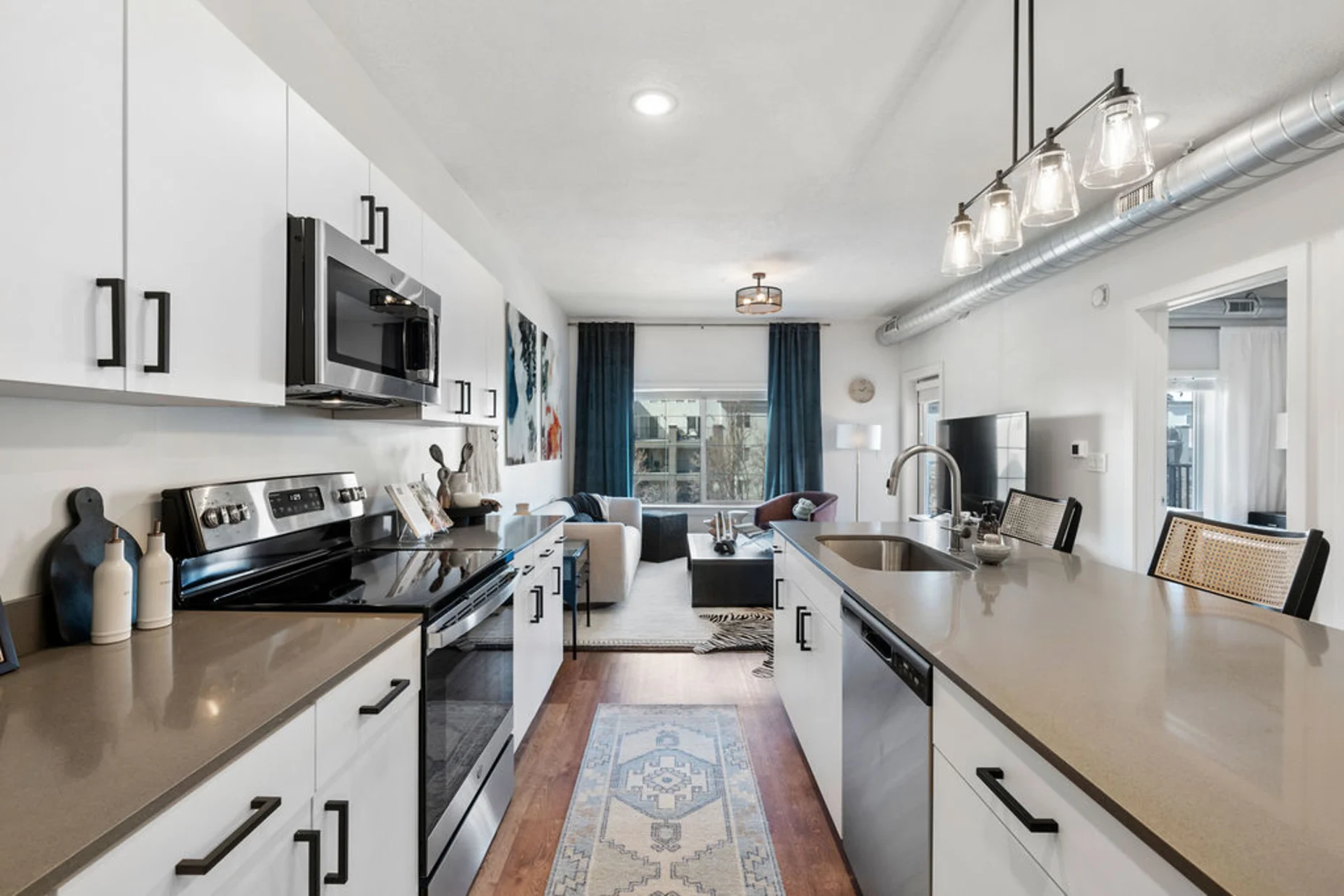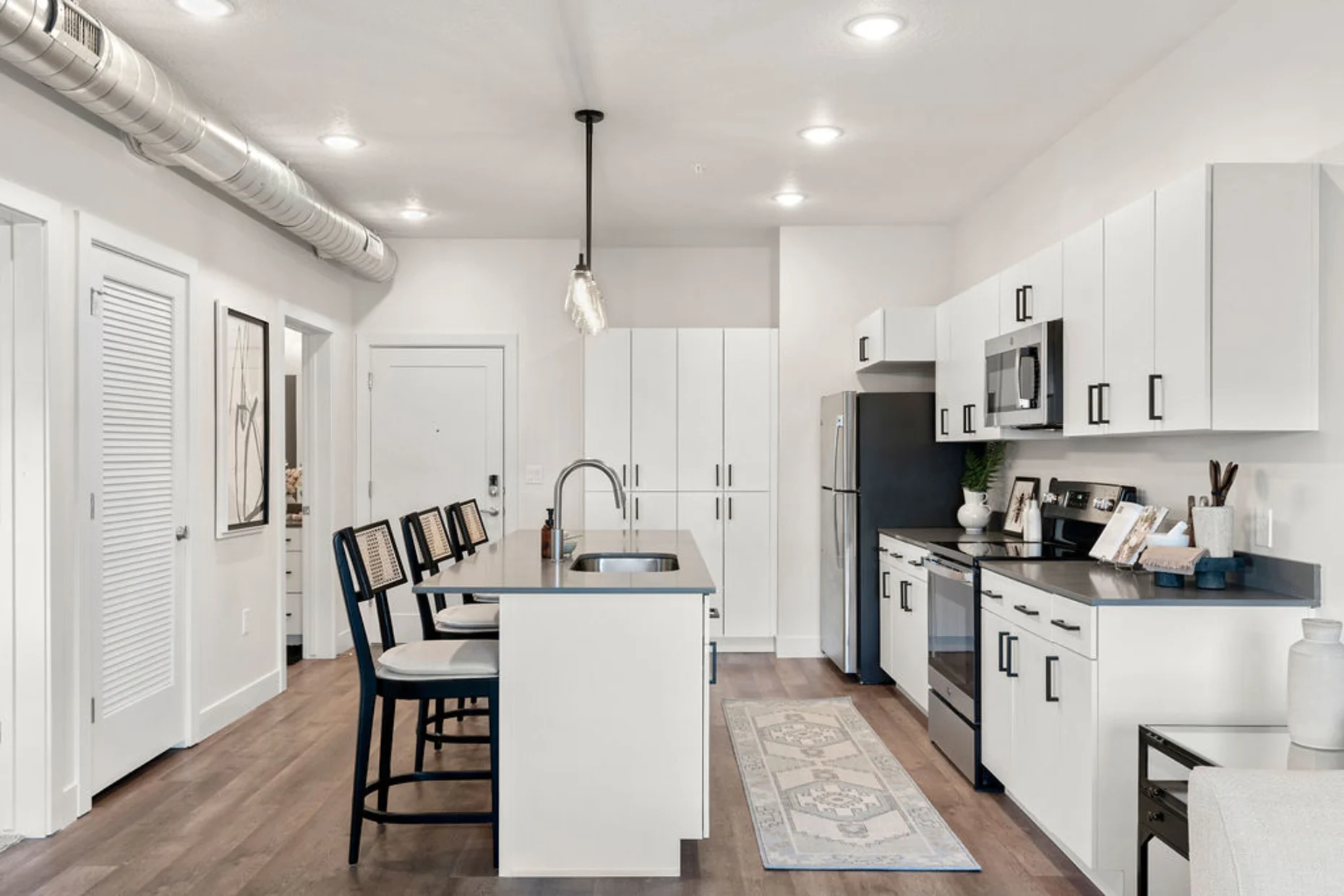 We provided the cabinetry and quartz countertops for The Revival in downtown Salt Lake City, a vibrant multifamily community that brings bold design and smart finishes together. Located in the Warehouse District, this project stands out for its unique style and elevated interiors.